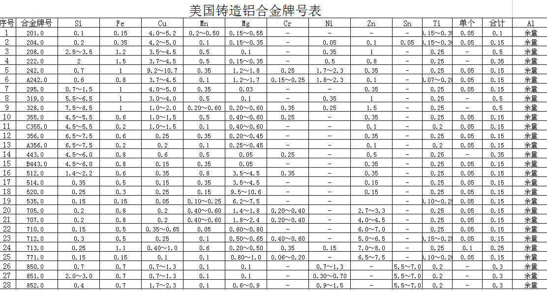 美国铸造铝合金牌号表